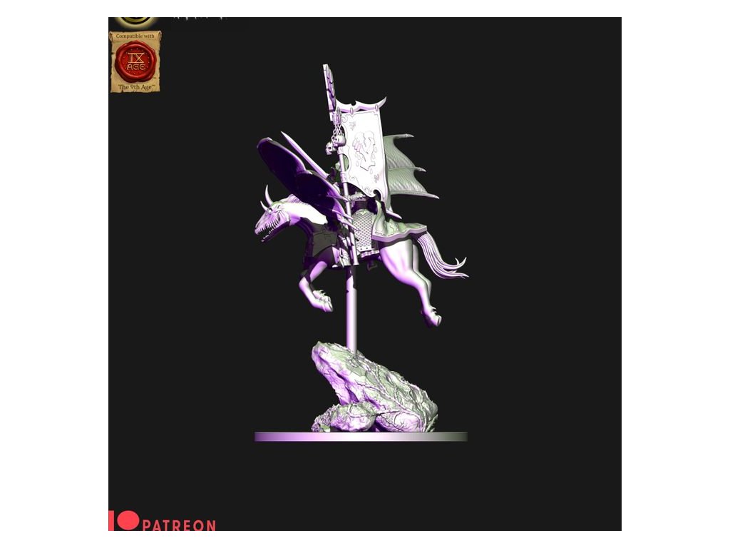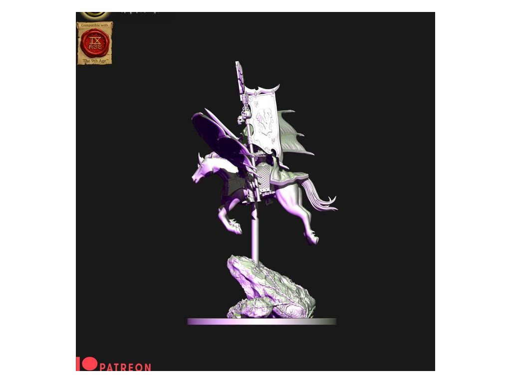 This pack contains 1x Dark elves hero with banner on Nightmare pegasus. As you can see on renders pgeas have two version, one with skull head and second with regular head. Miniatures comes presupported and with nice scenic bases as seen on the renders. The base doesnt need any supports. Just print it with its flat bottom faced towards building plate