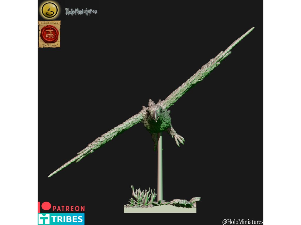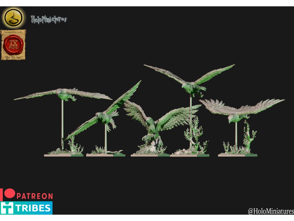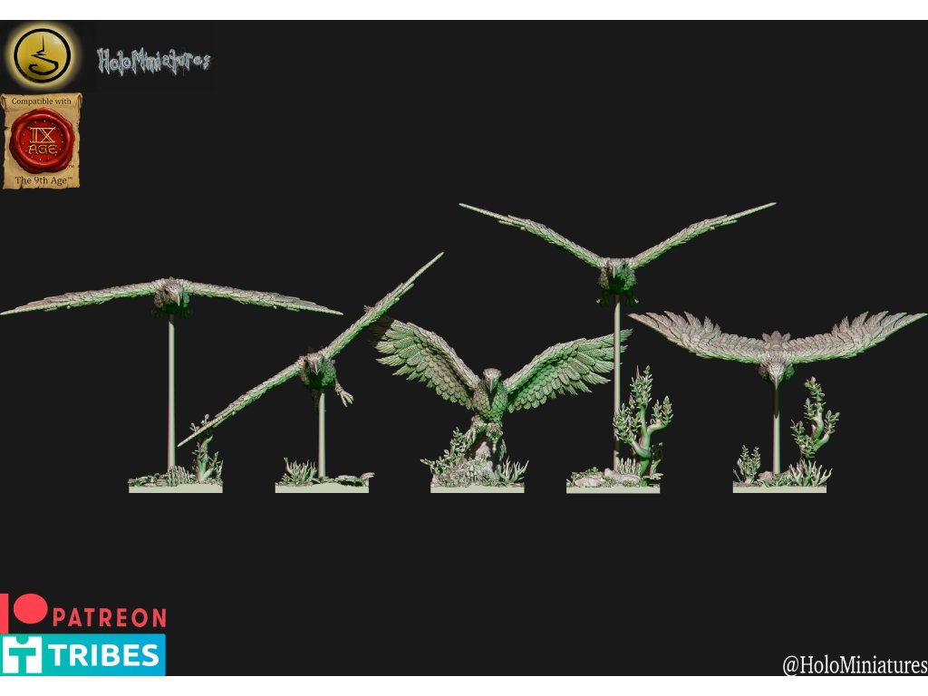 This pack contains 5x elven eagle. Miniatures comes presupported and with nice scenic bases as seen on the renders (both round and square).